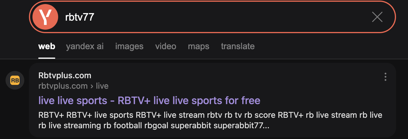 Ahora buscamos en Google el servicio RBTV77 y es probable que no salga nada. Así que probamos en el buscador Yandex o Bing: